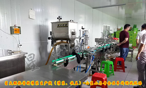 目前該灌裝生產線完全經過調試安全后,正式投入到客戶的生產當中,經過客戶現場生產演示的反饋,山東小馬哥食品有限公司對星火的這款顆粒醬料生產線非常滿意!