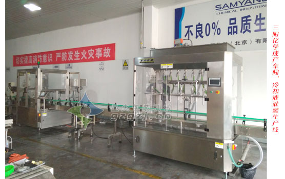 三陽化學北京有限公司是2004年成立的一家以生產優質汽車防凍液、玻璃水、脫脂劑、磷化劑和表面處理劑等產品的企業,日前在我公司購置了冷卻液灌裝生產線,該冷卻液灌裝生產線由八頭冷卻液灌裝機、全自動旋蓋機、鋁箔封口機、重量識別機和紙箱噴碼機組成。現已在三陽化學投入生產,用于桶裝冷卻液、防凍液、玻璃水、車輛齒輪油、潤滑油等液體或流動性好的油脂類產品的自動化生產。